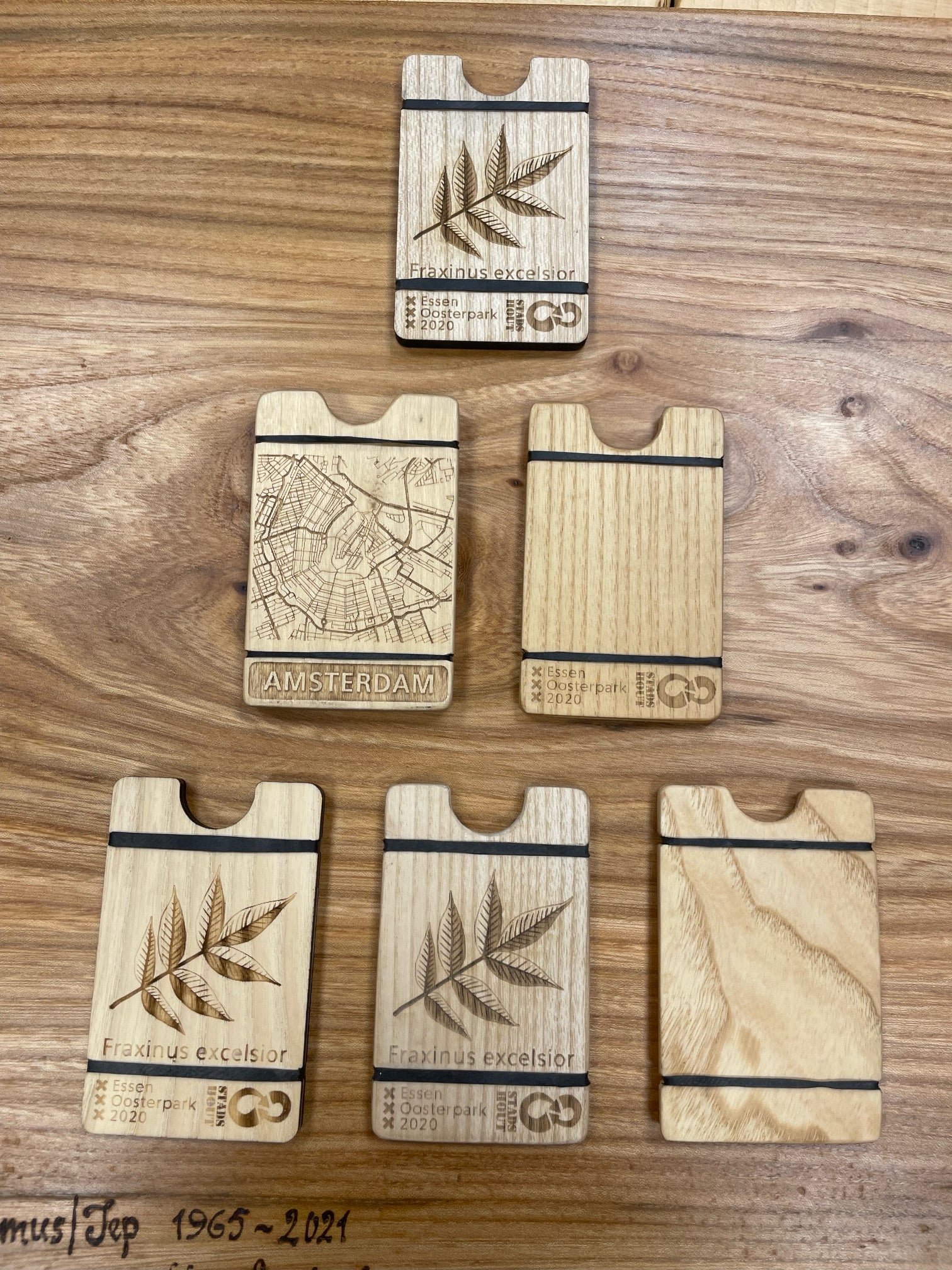 Each wallet is engraved with the tree species from which it is made and the location in Amsterdam where the tree once grew. The elastic straps are made from bicycle innertubes, making it a 100% recycled product.